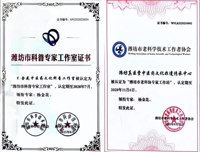 8月,其领衔的“杨金花中医药文化科普工作室”被潍坊市科学技术协会认定为:“潍坊市科普专家工作室”;9月,由其创办领衔的潍坊真医堂中医药文化非遗传承中心,被潍坊市老科协技术协会授予:“潍坊市老科协专家工作站”。