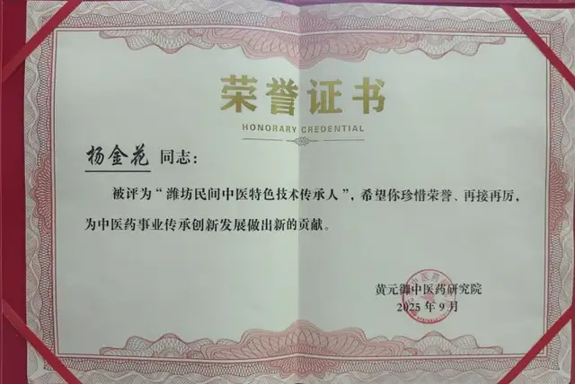 此次获评 “潍坊民间中医特色技术传承人”,对杨金花院长而言,是一份沉甸甸的荣誉,更是一份光荣使命。它象征着黄元御中医药研究院及社会各界对其扎根民间、服务百姓、守正创新之路的充分肯定。